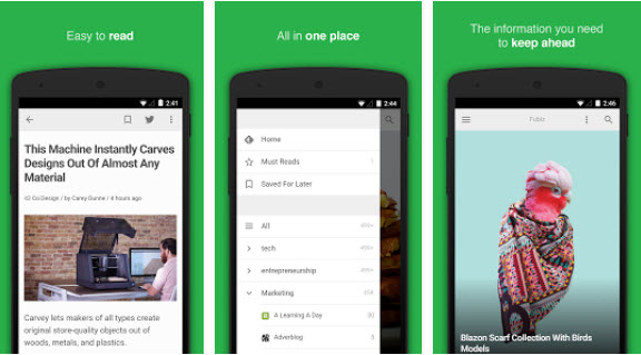 تعتبر خدمة feedly من أفضل الخدمات على الأنترنت والتى توفر لك أمكانية متابعة جميع المواقع المفضلة لديك على الأنترنت والحصول على جميع المقالات الأخبارية وكل شىء فى الموقع، هذا ويوفر لك الموقع أمكانية تقسيم المواقع الى أٌقسام وفئات للوصول بشكل أسرع ومنظم الى كل شىء . ومؤخراً تم أطلاق تطبيق feedly للهواتف والأجهزة بنظام أندرويد، وبمجر أن تقوم بتثبيت التطبيق على هاتفك سيكون بامكانك متابعة جميع المواقع الأخبارية وغيرها من المواقع فى مكان واحد بدلاً من البحث وتصفح موقع ثم الأخرى وهو ما يضيع الوقت والجهد . {play.google}