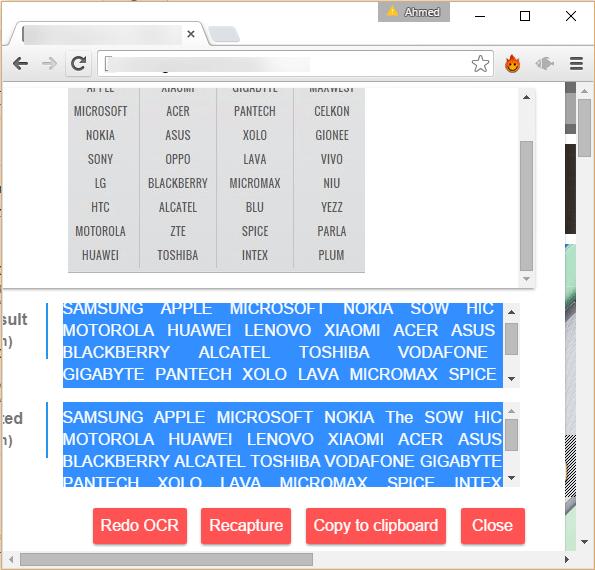 – بعد تحديد النص سيكون بامكانك نسخ النص الموجود على الصورة او الفيديو او الفلاش بالضغط على ” copy to clipboard ” او الضغط على ” Recapture ” لالتقاط صورة اخرى جديدة .