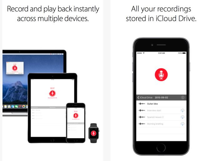 هذا التطبيق عبارة عن مسجل صوت من خلاله يتم مزامنة التسجيلات بشكل تلقائى مع جميع الاجهزة الخاص بك مثل  آيفون وآيباد وساعة أبل ووتش والمك، ويعتبر هذا التطبيق مثالى جداً لالتقاط الاصوات كما انه يدعم Just Press Record وهى خاصية خاصة بمشاركة التسجيلات عبر التطبيقات المختلفة مثل  البريد الإلكتروني أو دروب بوكس أو الرسائل وغيرها .