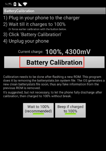 – فى البداية يجب ان تكون بطارية الهاتف مشحونة بنسبة 100%، ثم قم بتحميل وتثبيت تطبيق Battery Calibration على الهاتف . وبعد الانتهاء من تثبيت التطبيق على هاتفك تظهر لك الصورة ادناه قم بالضغط على ” battery calibration ” .