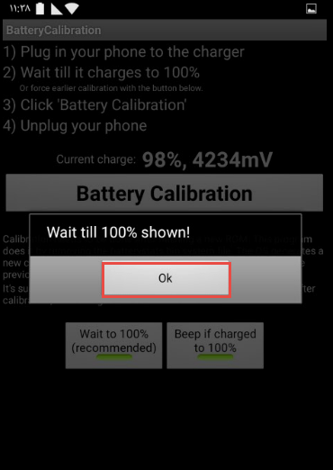 – ثانياً سوف تظهر لك رسالة اضغط على ” OK ” وسوف تلاحظ انخفاض بطارية الهاتف من 100% الى نسبة اقل على الرغم من عدم استخدامك للهاتف وهذه النسبة هى الشحن الوهمى وبهذه الطريقة ستكون تخلصت من الشحن الوهمى للبطارية .