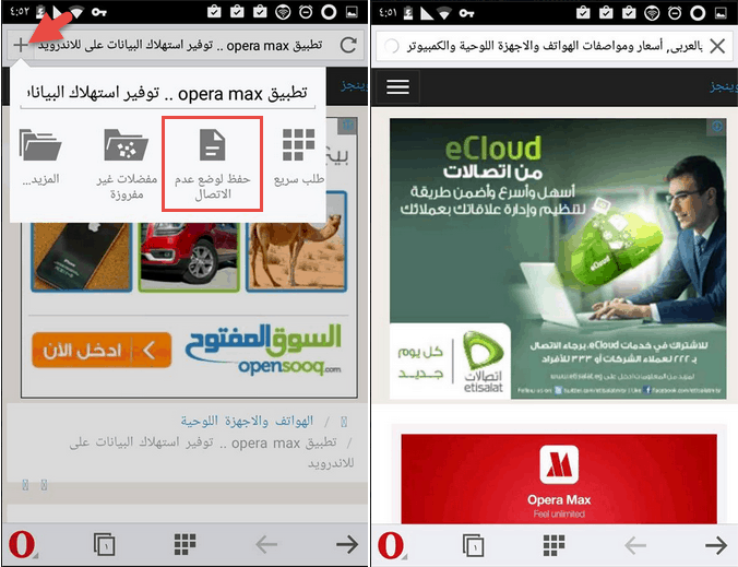 اولاً : اثناء تصفحك لاى موقع على الانترنت من متصفح اوبرا مينى من شاشة هاتفك تجد فى الاعلى علامة + على يسار الشاشة – قم بالنقر عليها واختر خاصية ” حفظ لوضع عدم الاتصال ” .
