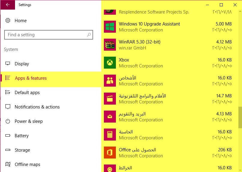 بعد الأنتهاء من التحديث والترقية الى التحديث السنوى لويندوز 10 سوف تلاحظ أن قائمة إبدأ تضم عدد كبير جداً من التطبيقات الجديدة والتى تأتى بشكل مسبق وأساسى من النظام وفى الغالب يكون من بين هذه البرامج بعض البرامج التى لا يحتاج أليها المستخدمين حيث أن أغلب هذه التطبيقات تكون موجه فى الأساس للمستخدمين الذين لديهم هواتف تعمل بنظام ويندوز فون،على أى حال يجب عليك الأن حذف التطبيقات الجديدة والتى لا تحتاج أليها من أجل تسريع الحاسوب، وللقيام بحذف هذه التطبيقات أنتقل الى Settings ثم System ومن القائمة الجانبية قم بتحديد قسم Apps & features وستجد جميع التطبيقات الجديدة .