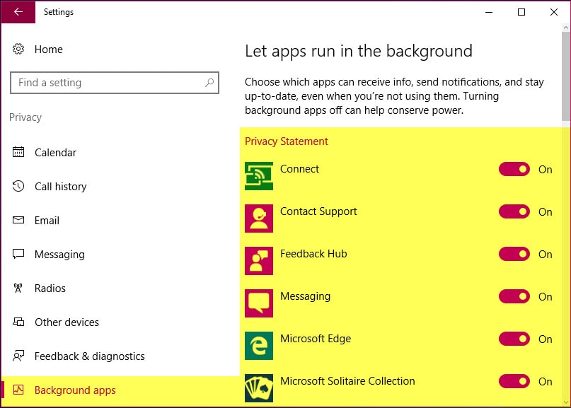 ربما يقول بعض المستخدمين أنه قام بأيقاف وتعطيل البرامج من العمل فى الخلفية قبل التحديث أقول له تم تفعيلها بعد التحديث والترقية الى التحديث السنوى ويتوجب عليك الأن أيقاف البرامج العاملة في الخلفية خصوصاً اذا كنت تريد تسريع ويندوز 10 وجهاز الكمبيوتر الخاص بك وذلك لأنها تستهلك موارد الحاسوب مثل الرامات والمعالج وهى من أهم الخطوات التى تساعد بكل تأكيد فى تسريع الحاسوب، ولتعطيل هذه البرامج أنتقل الى ” Settings ” ثم الى قسم ” Privacy ” ومن ثم أضغط على ” Background apps ” لتظهر لك جميع البرامج التى تعمل فى الخلفية وتقوم بأيقافها عن طريق الضغط على زر on لتحويله إلي OFF .