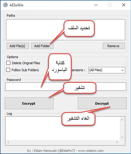 عند النقر على أيقونة الأداة سوف تفتح معك على الفور لتشفير ملف تقوم بالضغط على خيار add folder وتحديد الملف وبعد ذلك تقوم بكتابة الباسور فى الخانة الباسورد ثم بعد ذلك الضغط على خيار تشفير Encrypt وسوف تلاحظ على الفور تشفير الملف الخاص بك .