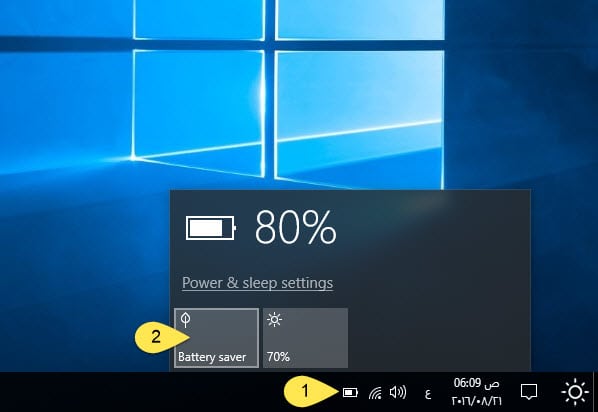 1 : هناك أثنين من الطرق التى تساعد المستخدمين فى تفعيل وضع حفظ الطاقة فى ويندوز 10، الطريقة الأولى تكون من خلال الضغط على علامة البطارية ثم بعد ذلك تقوم بالضغط على ” battery saver ” كما فى الصورة ادناه .