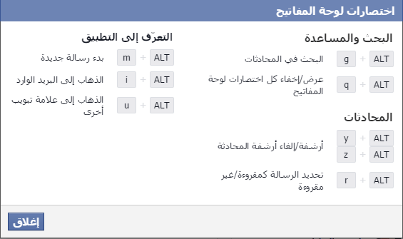 بعد الدخول الى الدردشة فى الفيس بوك – قم بالضغط على مفتاح alt+q فى الكيبورد – وسوف تلاحظ ظهور القائمة المخفية والتى تحتوى على جميع الاختصارات الخاصة بالدردشة.
