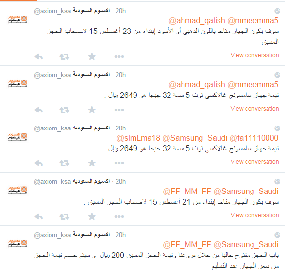 اعلنت الشركة الكورية سامسونج عن هاتفها سامسونج جالكسى نوت 5 الى جانب سامسونج جالكسى s6 ايدج بلس منذ بضعة أيام، واليوم أعلنت شركة اكسيوم السعودية على حسابها الرسمي على موقع تويتر أن هاتف جالكسى نوت 5 سيتوفر للبيع في السعودية إبتداء من يوم 23 أغسطس بسعر 2649 ريال سعودي لنسخة 32 جيجا بايت .