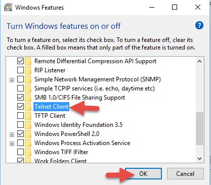 1 – تفعيل وتشغيل بروتوكول تل نت Telnet على جهاز الكمبيوتر الخاص بك والذى يساعد فى التحكم فى الأجهزة عن بعد، ولتفعيل البروتوكول أنتقل الى لوحة التحكم Control Panel ثم بعد ذلك أختر Programs and features ومن القائمة الجانبية أختر Turn Windows features on or off، تظهر لك نافذة جديدة تقوم بوضع علامة صح أمام Telnet Client كما فى الصورة أدناه .