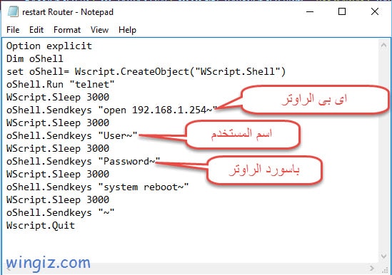 2 – فى هذه الخطوة تقوم بتحميل هذا الملف الصغير على جهاز الكمبيوتر والذى من خلاله ستكون قادر على عمل اعادة تشغيل للراوتر، بعد الأنتهاء من التحميل تقوم بفتح الملف بالضغط كليك يمين ثم أختر Edit، بعد فتح الملف تقوم بتعديل الأى بى الى اى بى الراوتر الخاص بك وكذلك تعديل أسم المستخدم وباسورد الراوتر كما هو مبين فى الصورة أدناه ومن ثم حفظ التعديل .