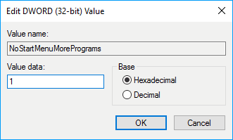 6 : نقوم بتغيير قيمة “NoStartMenuMorePrograms,” الى “1,” ثم النقر على ok .