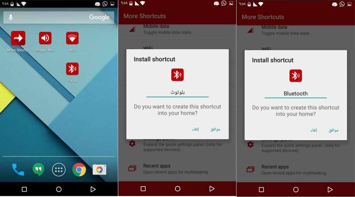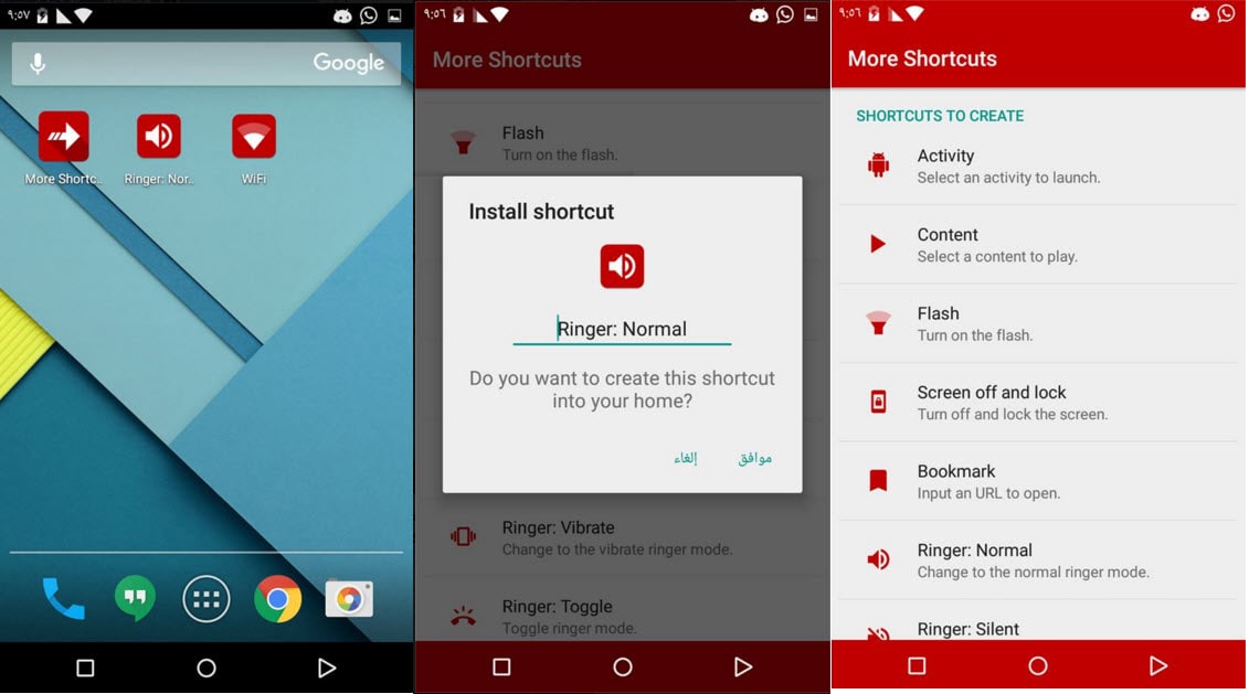 وسوف نحتاج الى تطبيق More Shortcuts المتوفر بشكل مجانى على متجر جوجل بلاى لأجهزة وهواتف اندرويد والذى يساعدك على عمل أختصارات متعددة على هاتفك للمحتويات مثل الفيديو، والصور والصوت والوثائق، تشغيل وأيقاف الفلاش والبلوتوث، كتم الصوت، واي فاي، لوحة الإعدادات .